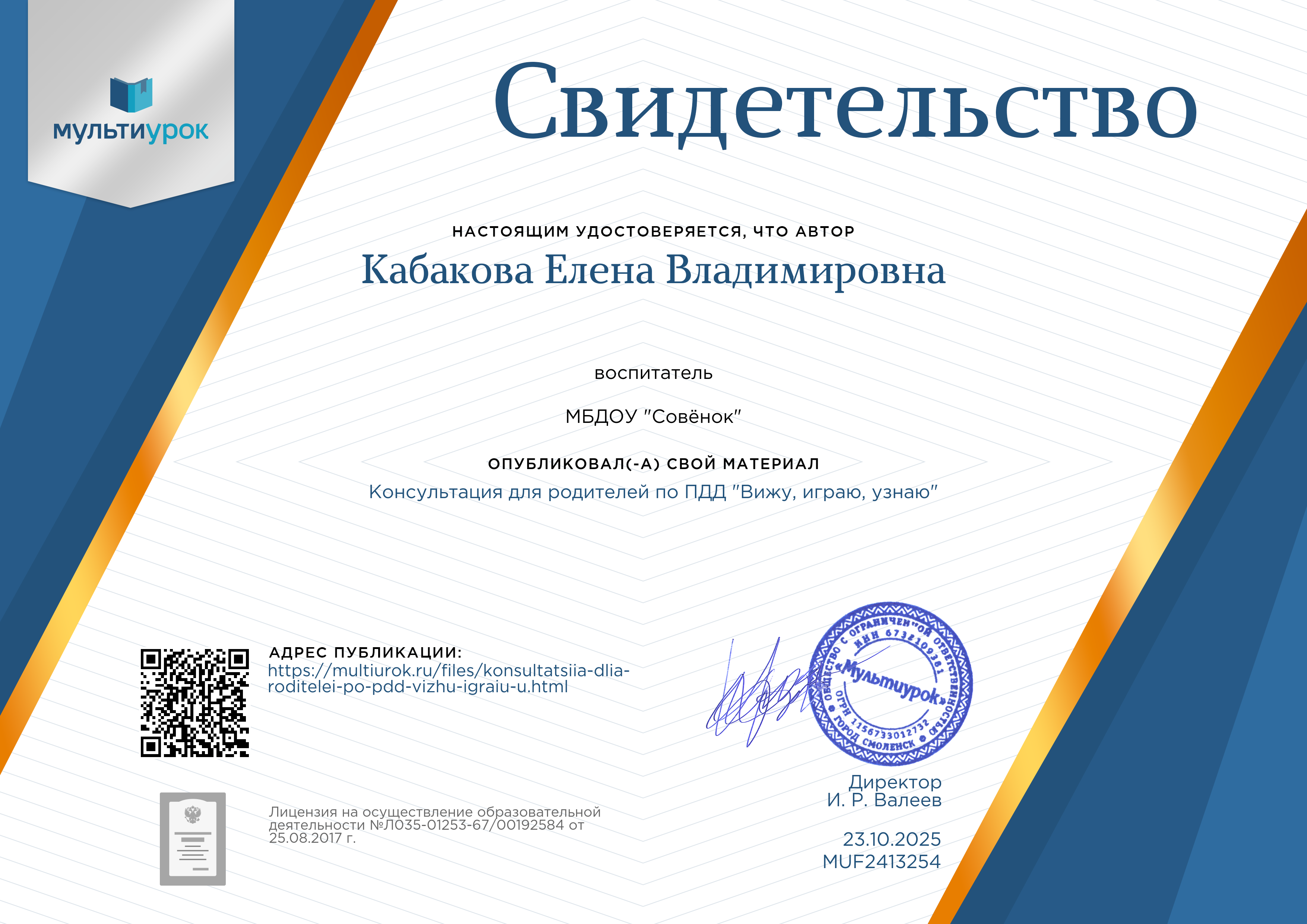 Консультация для родителей по ПДД "Вижу, играю, узнаю" 23.10. 2025