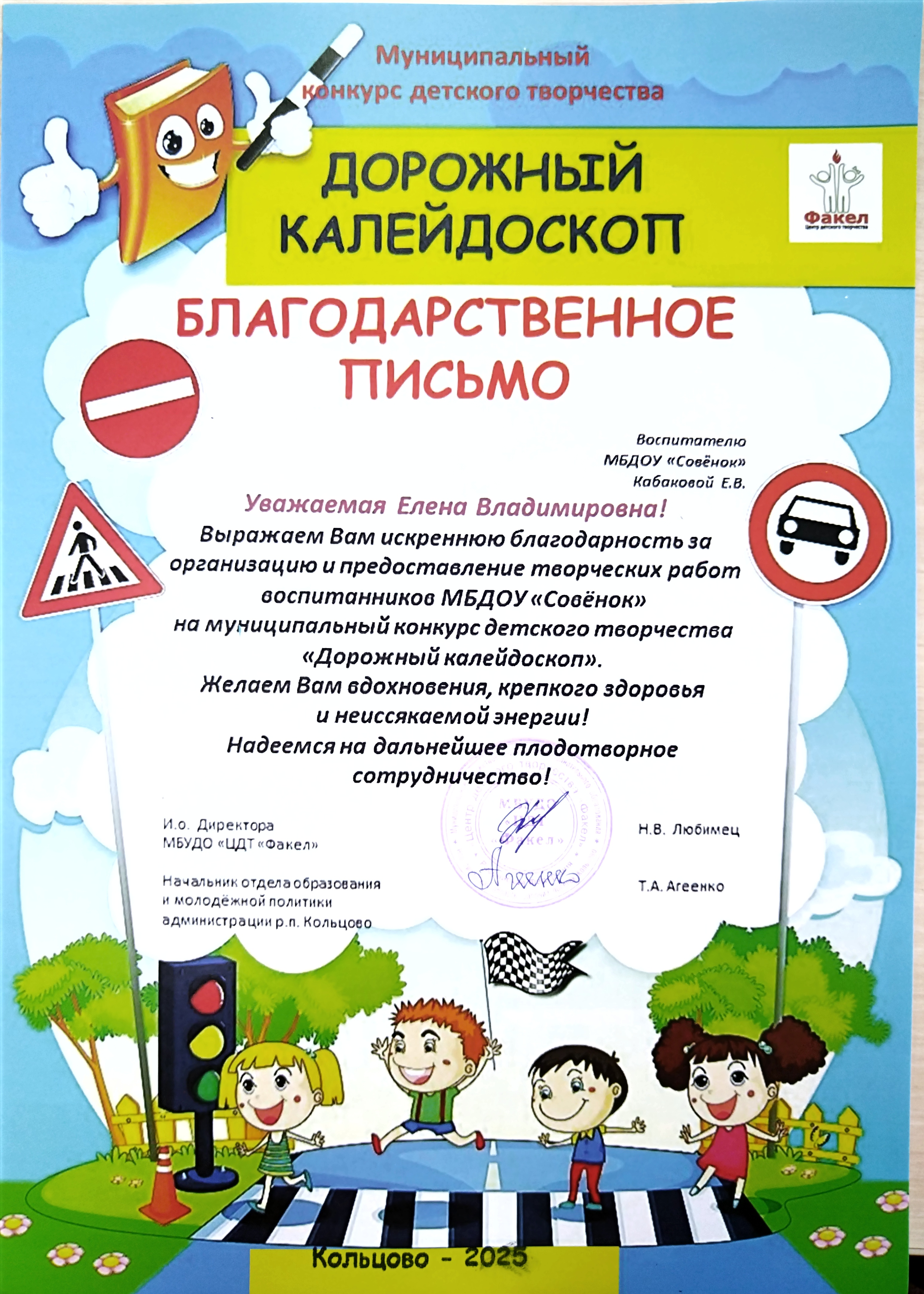 Благодарственное письмо за организацию выставки поделок на муниципальный конкурс детского творчества "Дорожный калейдоскоп" 2025
