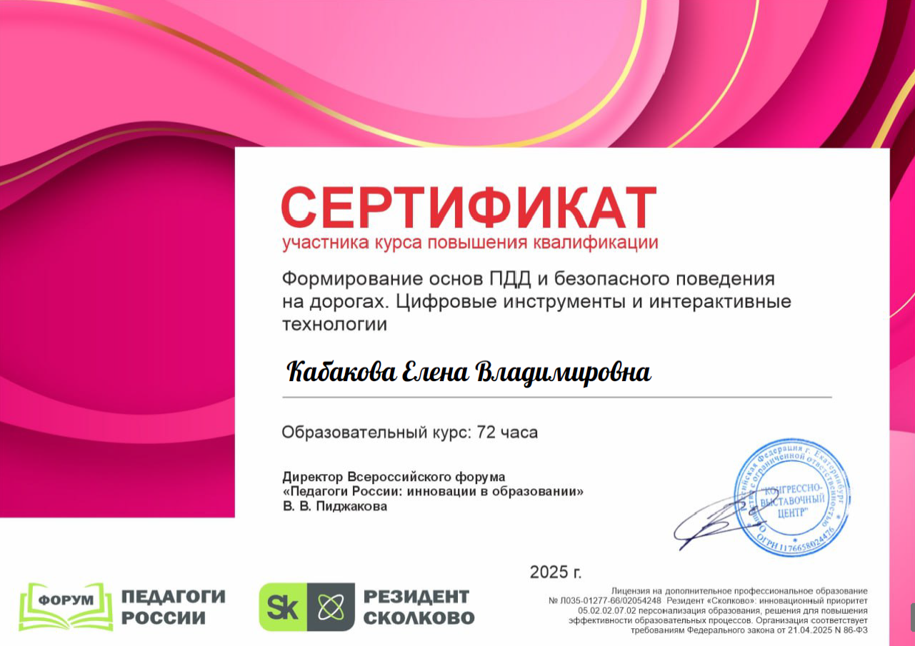 Сертификат участника курса повышения квалификации "Формирование основ ПДД и безопасного поведения на дорогах. цифровые инструменты и интерактивные технологии. 72 часа. 01.12.2025